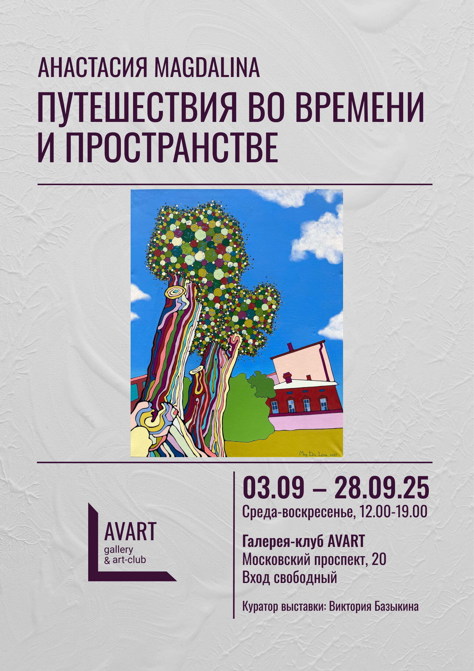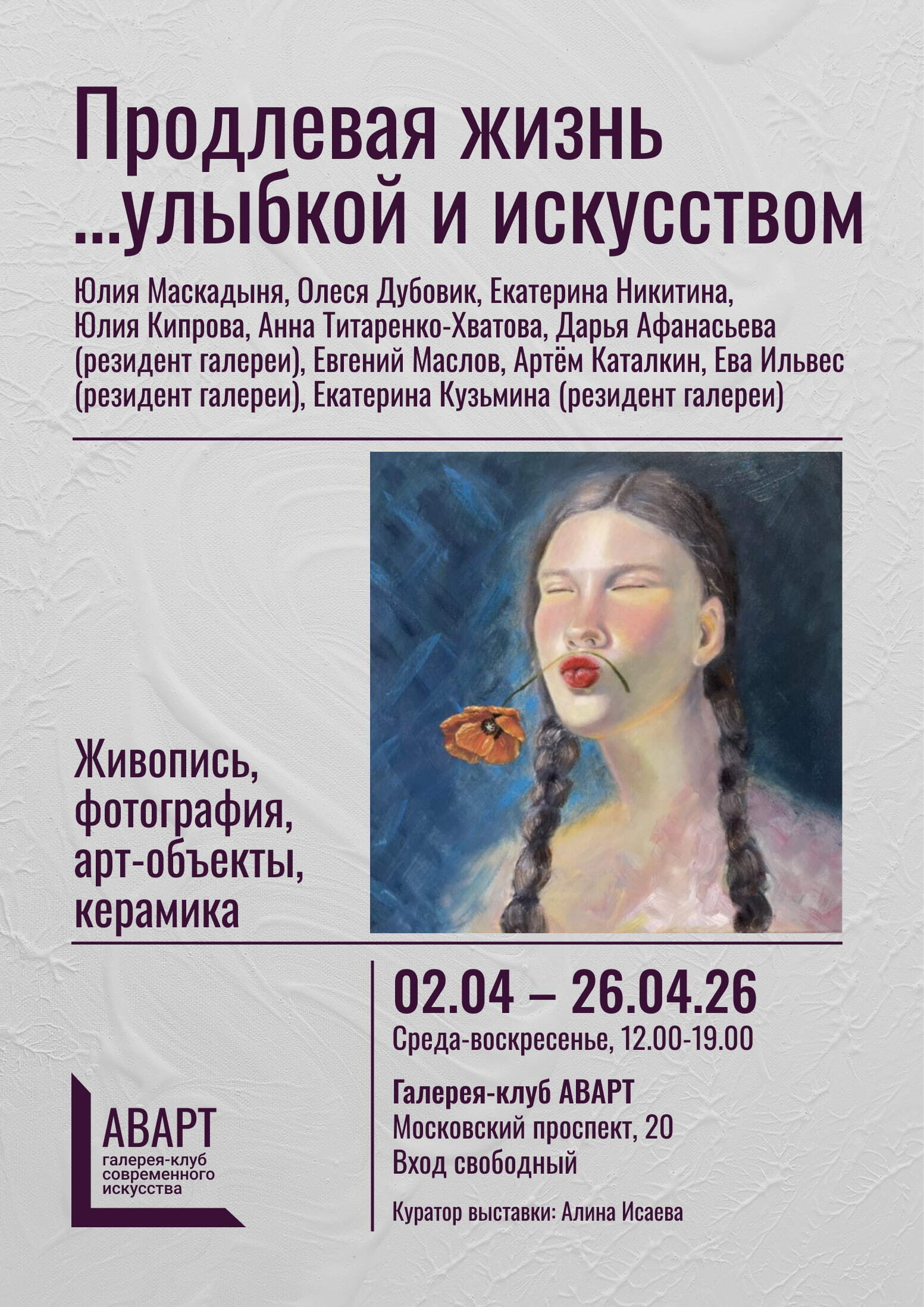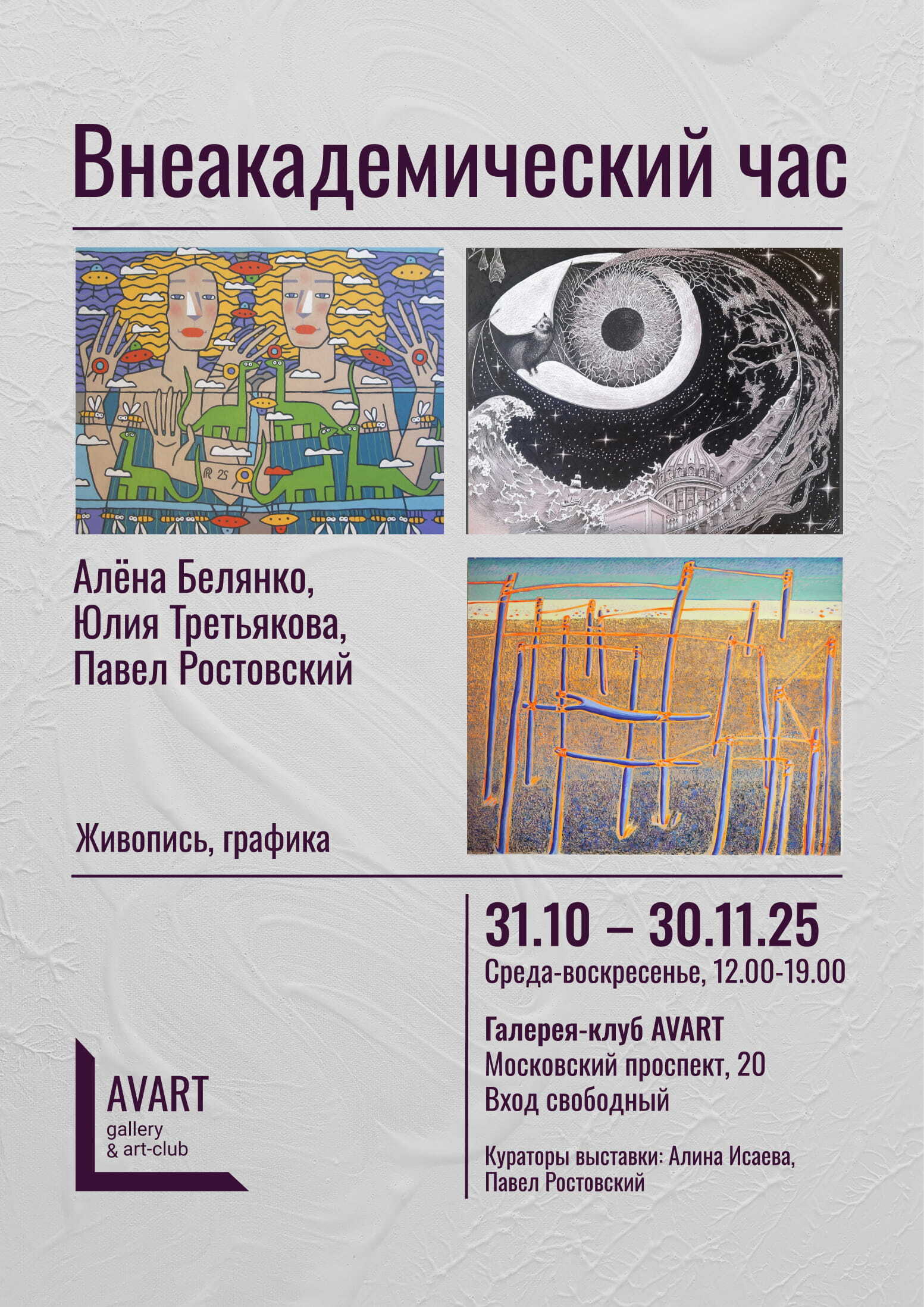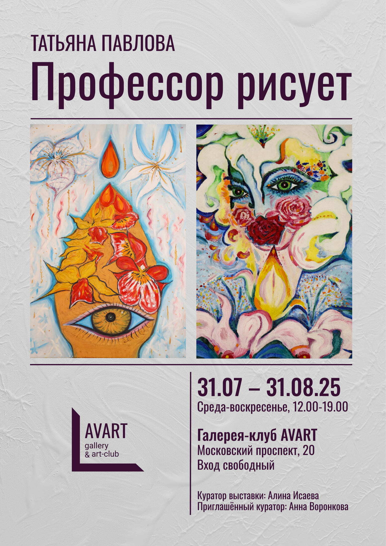 AVART галерея-клуб: это значит, что галерея – не только пространство, где выставлены картины. Мы объединяем талантливых людей: художников, кураторов, дизайнеров, зрителей. Мы не боимся экспериментировать, находим новые имена и даем возможность вам увидеть работы уже состоявшихся мастеров современного арт-мира.