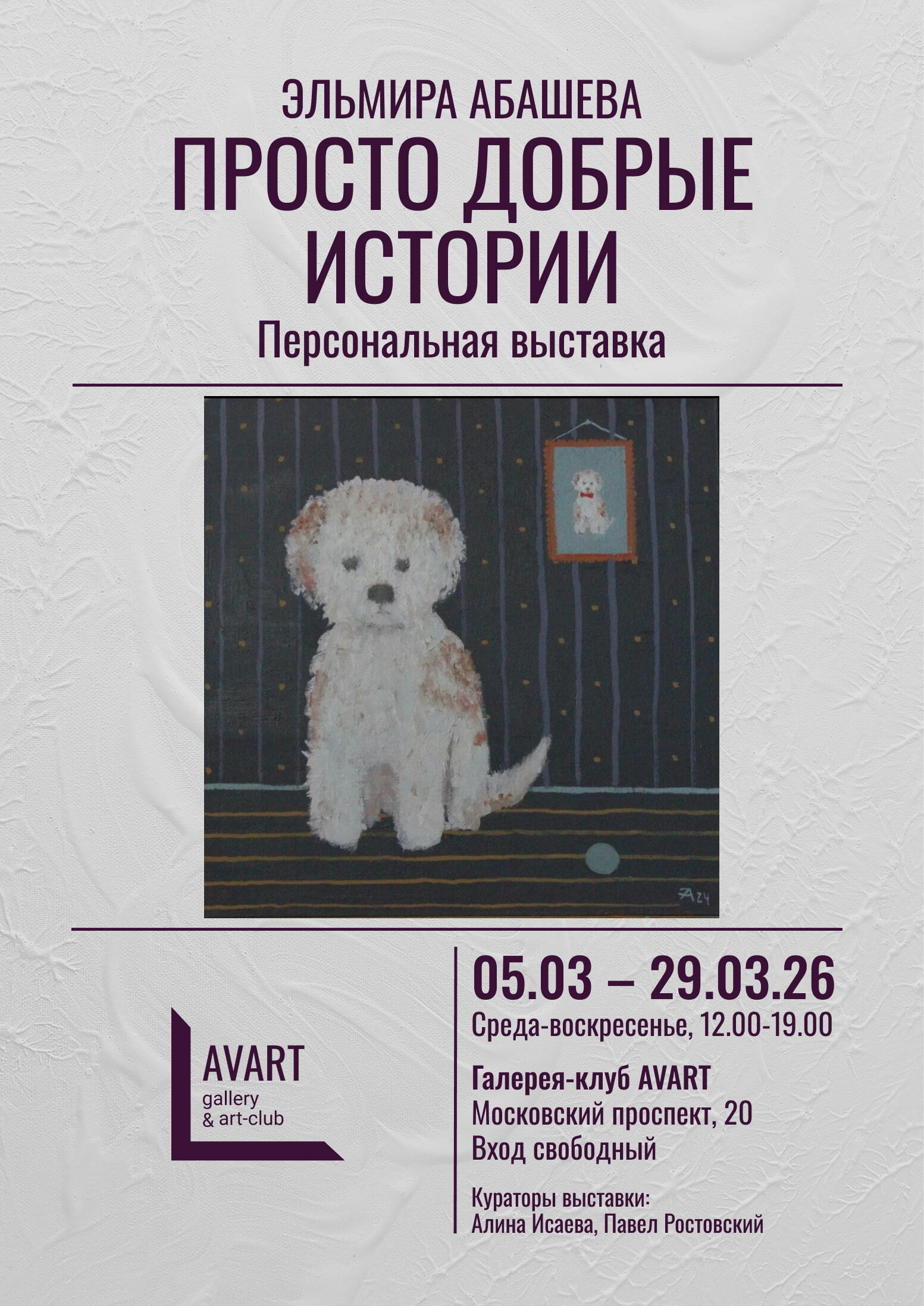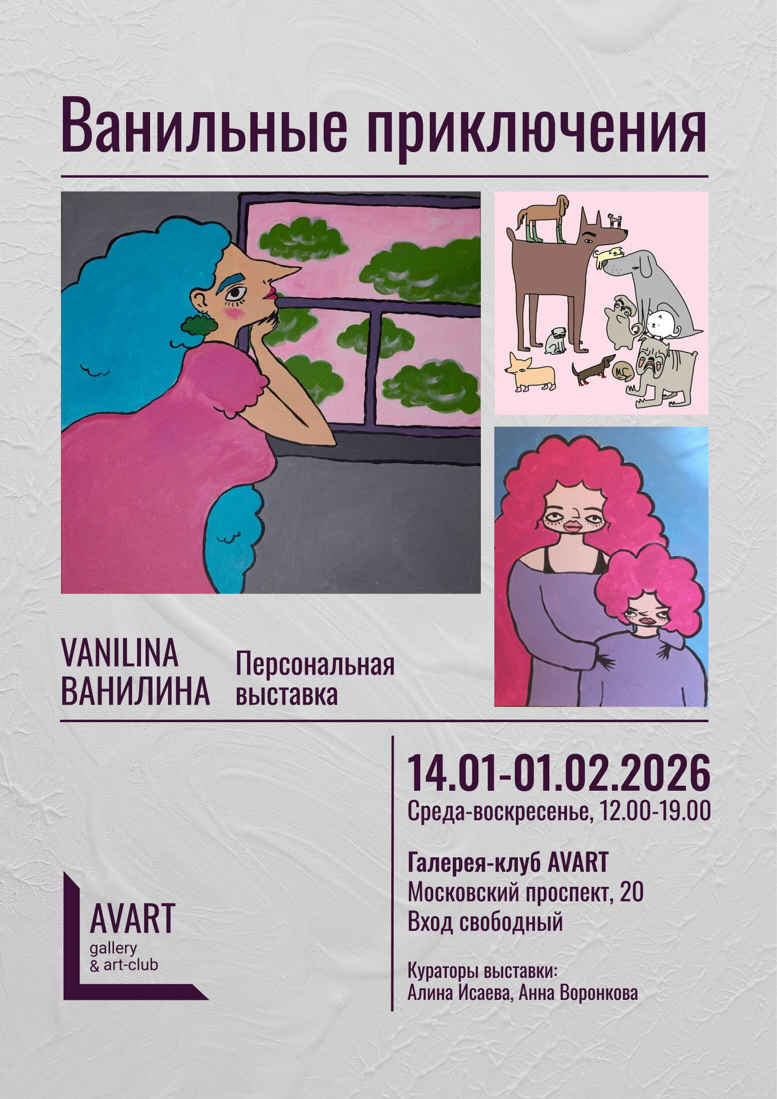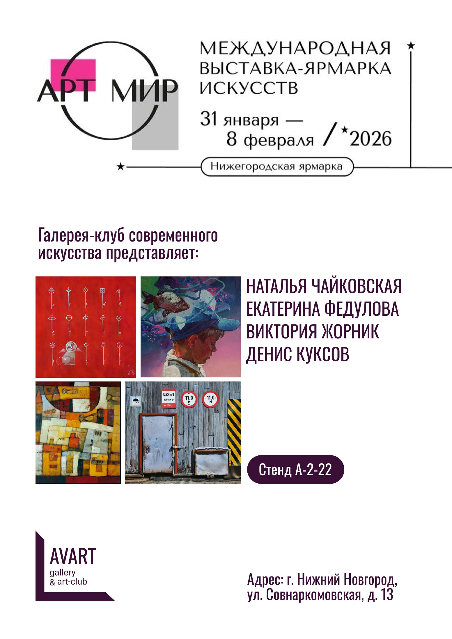 AVART галерея-клуб: это значит, что галерея – не только пространство, где выставлены картины. Мы объединяем талантливых людей: художников, кураторов, дизайнеров, зрителей. Мы не боимся экспериментировать, находим новые имена и даем возможность вам увидеть работы уже состоявшихся мастеров современного арт-мира.